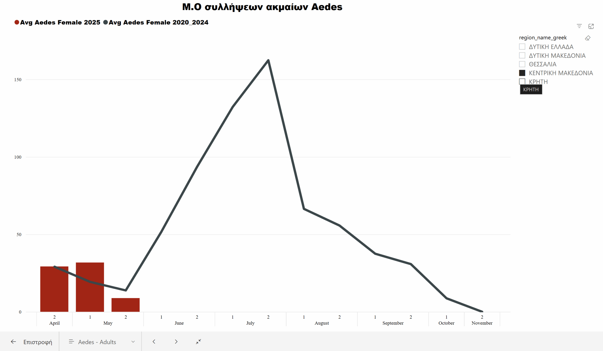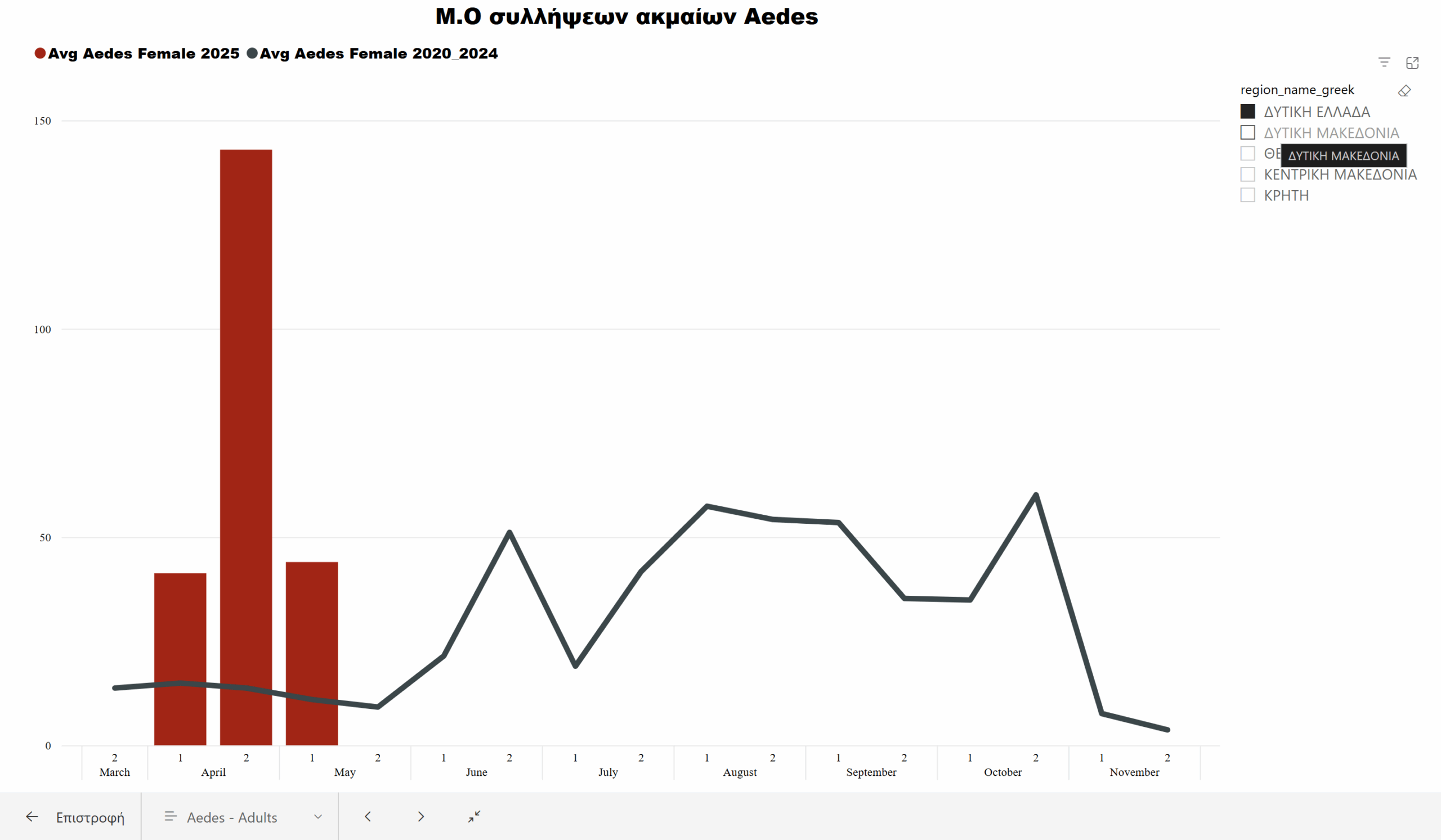 Την περίοδο αυτή, αξίζει να εστιάσουμε το ενδιαφέρον μας στο πλημμυρικό και ιδιαίτερα οχληρό κατά τη δύση του ηλίου είδους Aedes caspius (βλ. παρακάτω δείκτες προνυμφών και ακμαίων του γένους Aedes σε πέντε περιφέρειες):