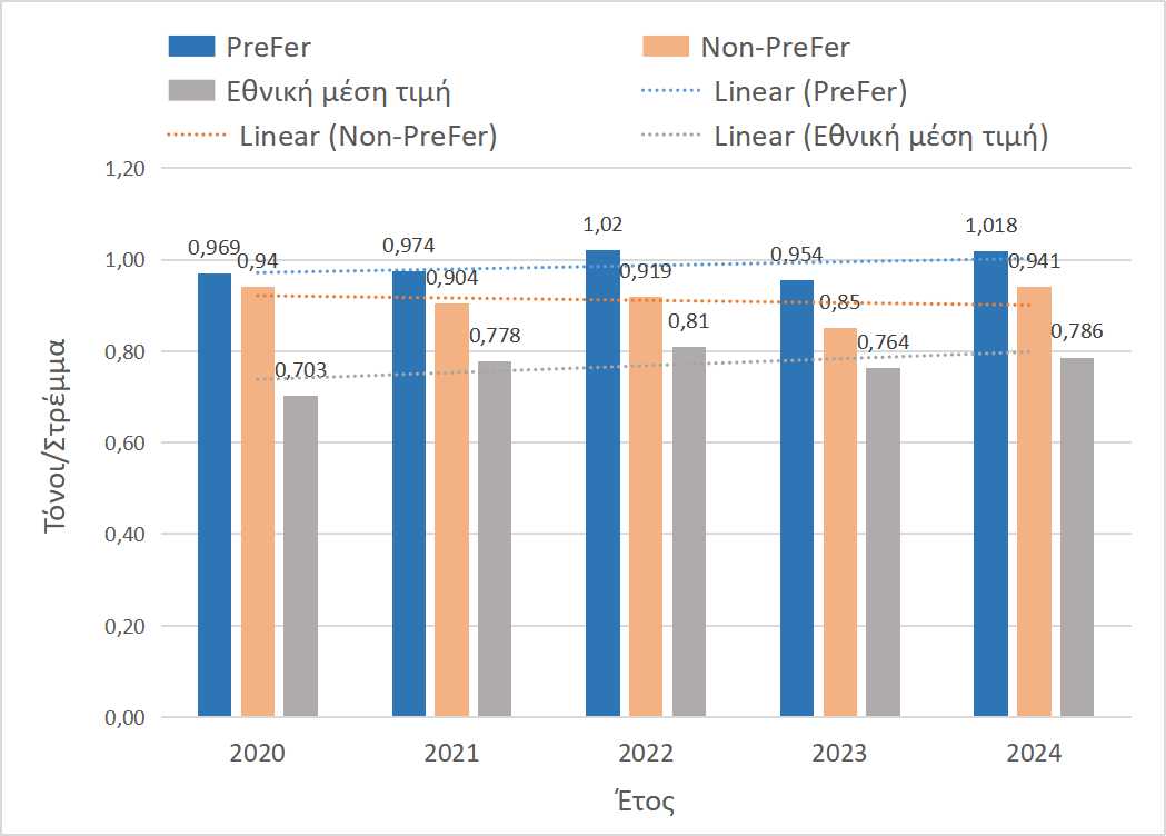 The first clear finding is that this year again PreFer producers achieve significantly higher yields (+8.2% on average) compared to the other producers, More specifically, the average price recorded by PreFer is 1,018 kg per hectare compared to 941 kg per hectare of the others. These differences confirm the consistently positive values in favour of PreFer throughout the past five years, which have ranged between 3.1 and 12.2%.
