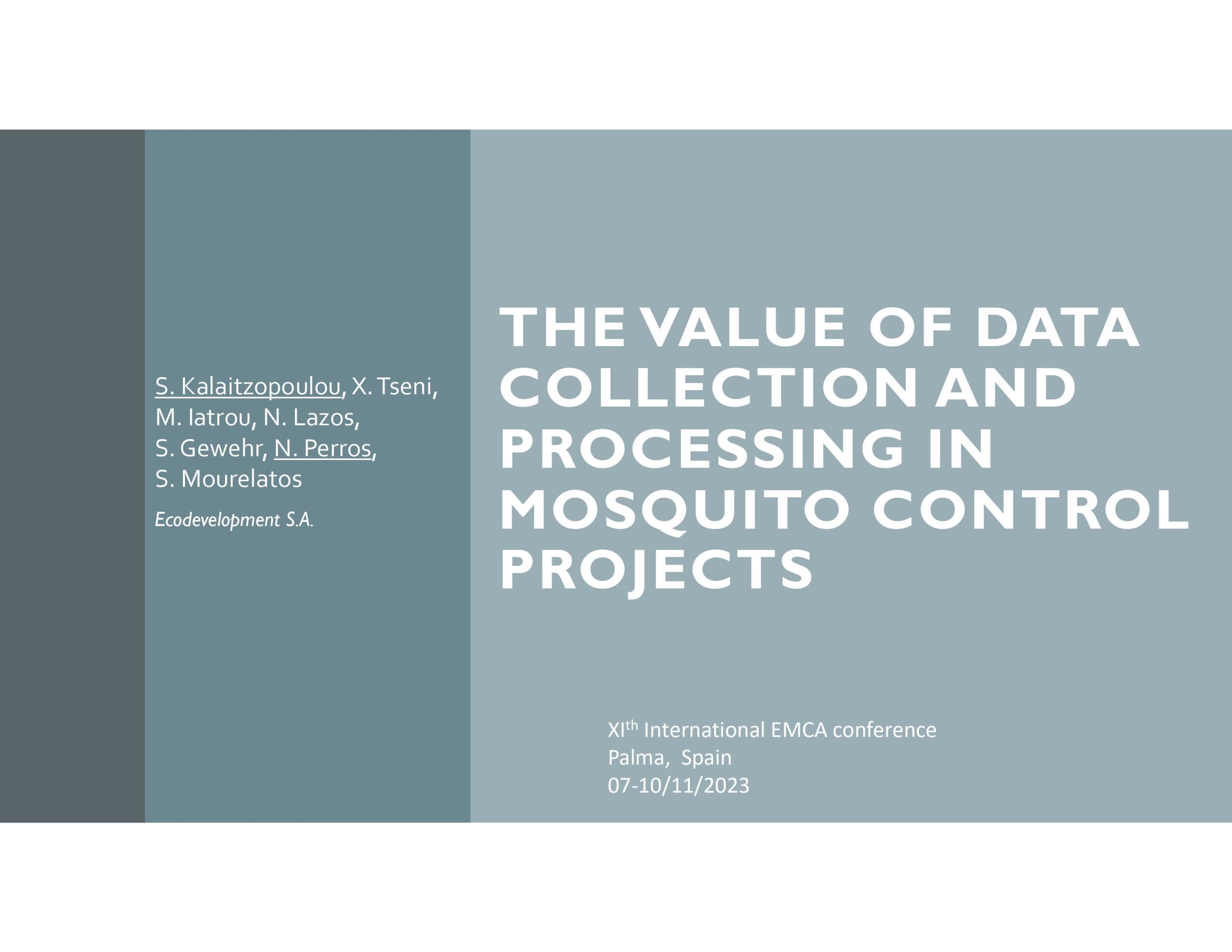 Stella Kalaitzopoulou, Director of Mosquito Control Projects of Ecodevelopment, made a presentation on “The importance of data collection and processing in mosquito control programmes” at the recent XIth Conference of the European Mosquito Control Association (EMCA) in Palma de Mallorca, Spain (07-10/11/2023). This presentation is the result of a collective effort and concerns a part of all the valuable field data collected for years by Ecodevelopment.